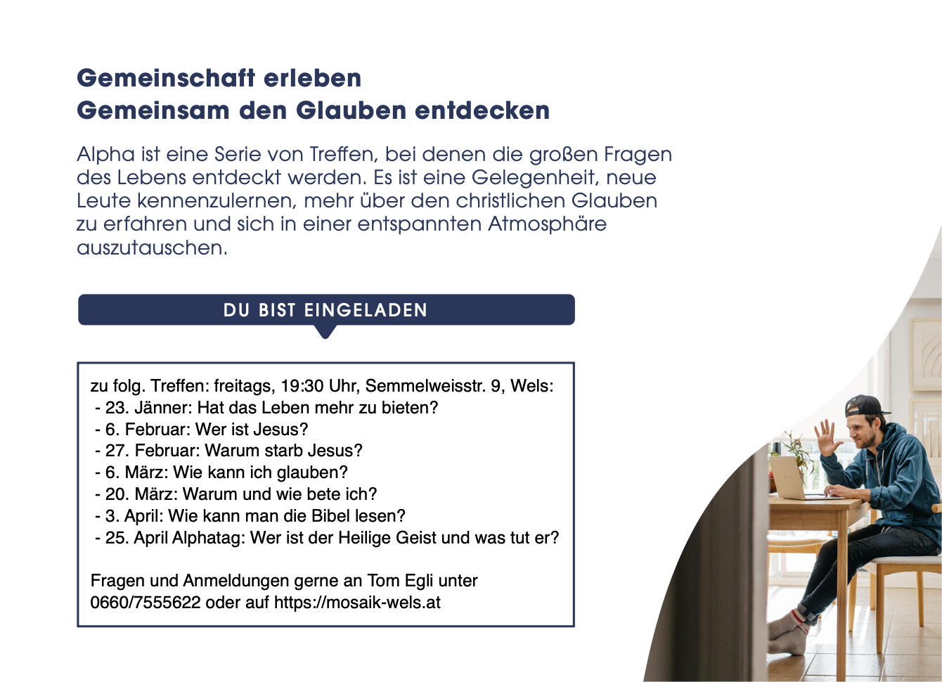 Wir als Mosaik Wels sind eine evangelikale Freikirche, ein neues Projekt des «Bundes Evangelikaler Gemeinden» und Partner der «Evangelischen Allianz Österreich». Momentan sind wir noch eine kleine Gruppe, aber wir haben große Träume!